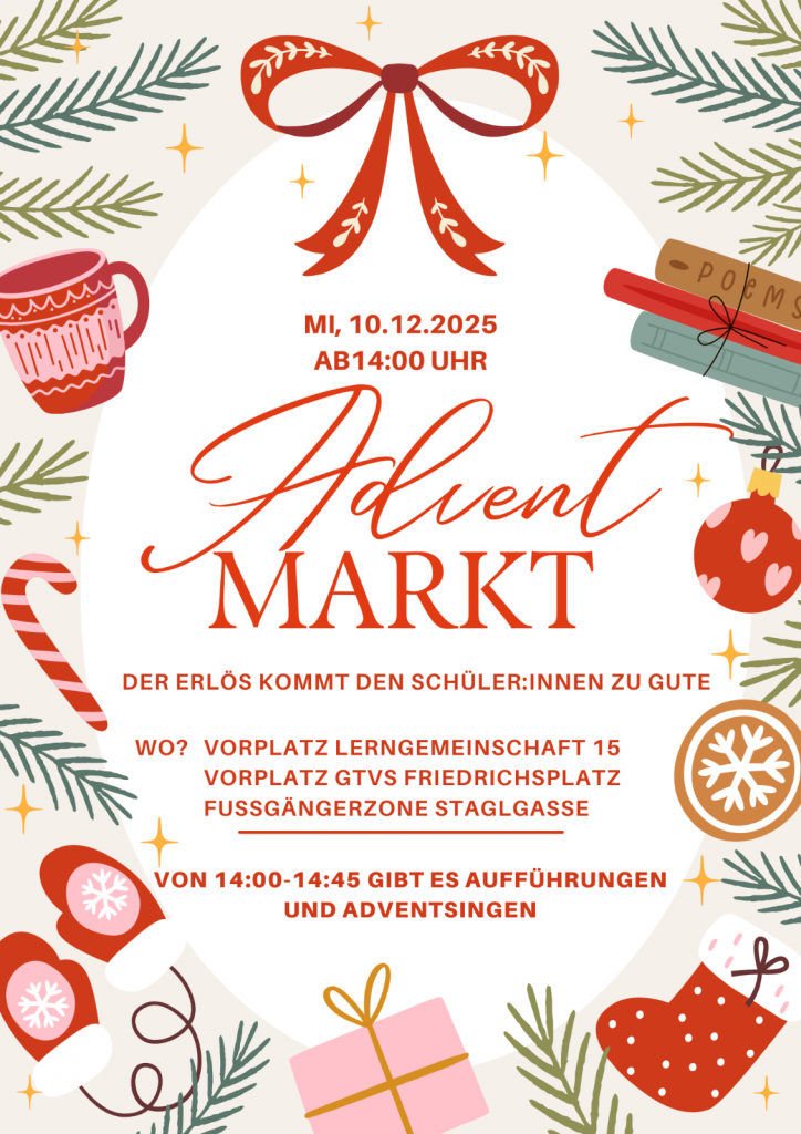 Herzliche Einladung zum Adventmarkt und Adventsingen der Lerngemeinschaft 15 & VS Friedrichsplatz. Am Mittwoch, 10. Dezember 2025 ab 14:00 Uhr! Im Fall von Schlechtwetter findet der Markt und das Singen am 17.12.2025 statt.
