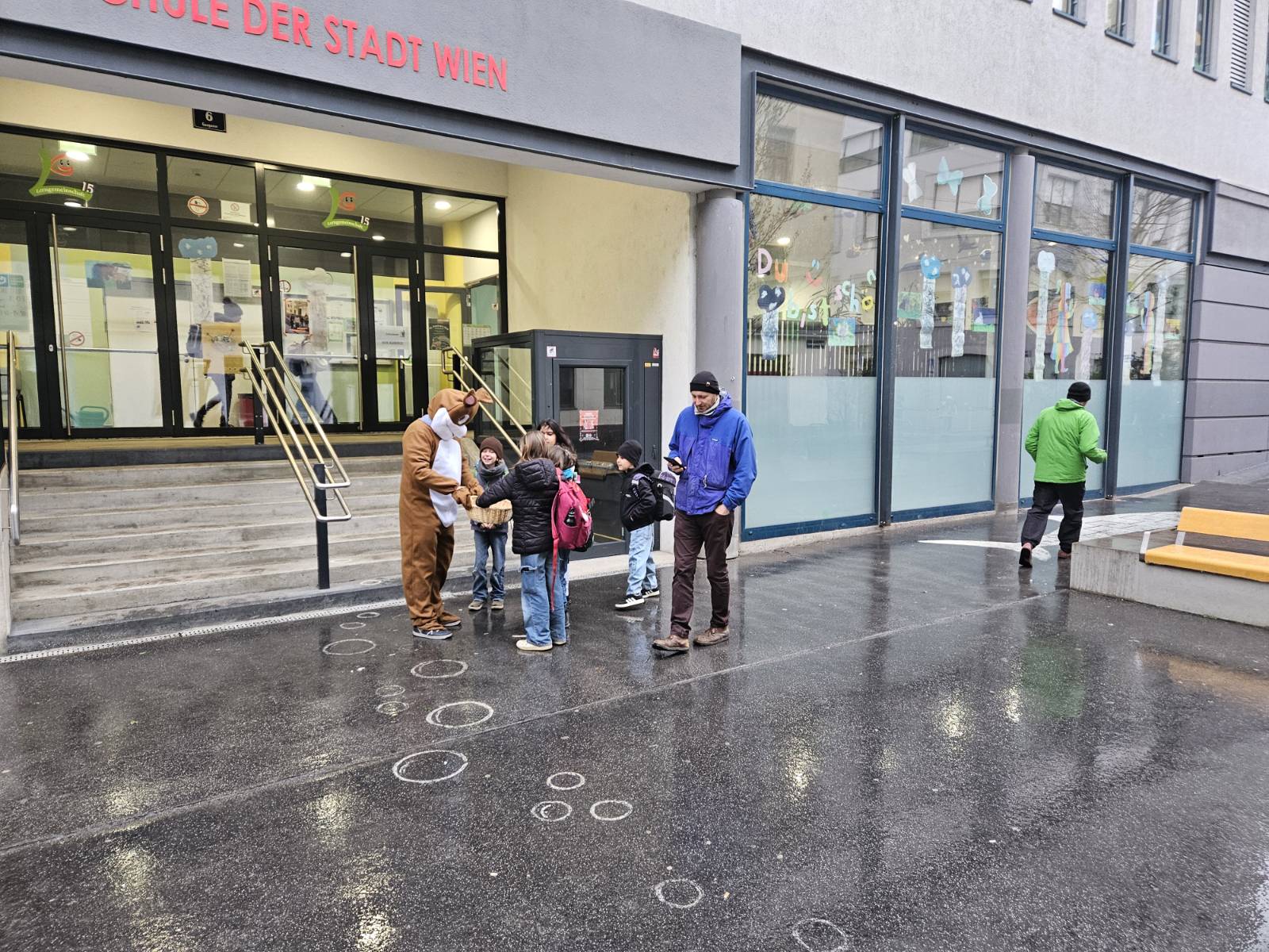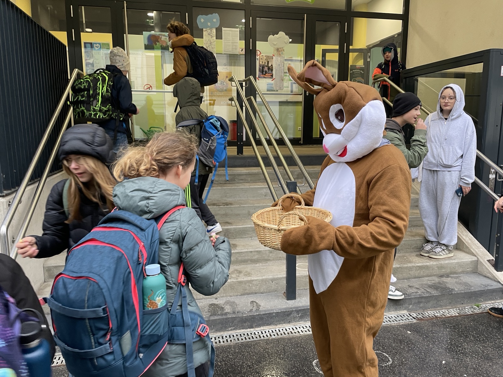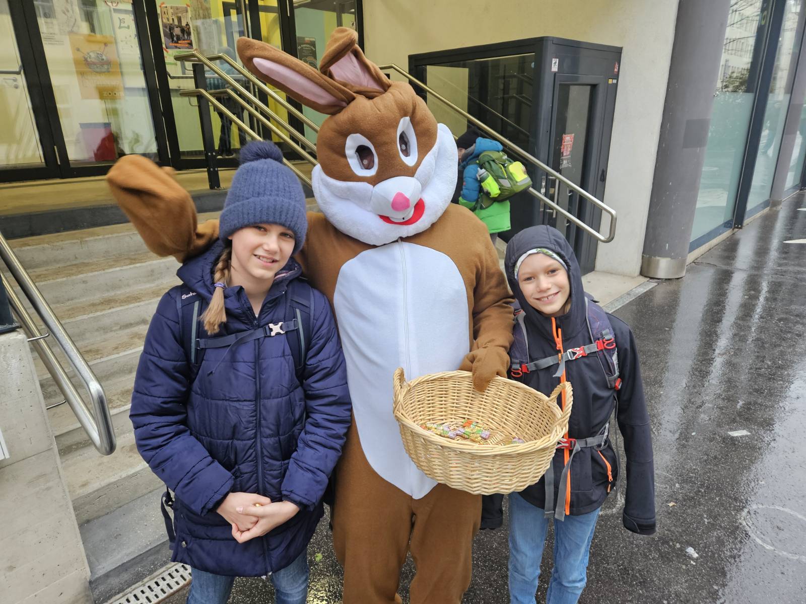 Der Osterhase (er heißt auch Rudi 🤔, wie unser Schulwart 😅) hat bereits am leider etwas verregneten Freitag in der Lerngemeinschaft und am Friedrichsplatz süße Kleinigkeiten an die Kinder (und Lehrerinnen und Lehrer) verteilt.